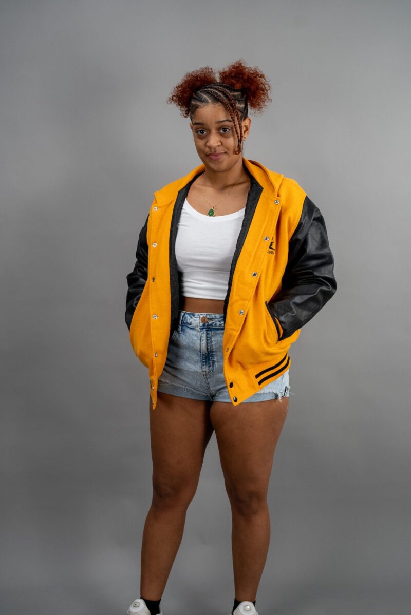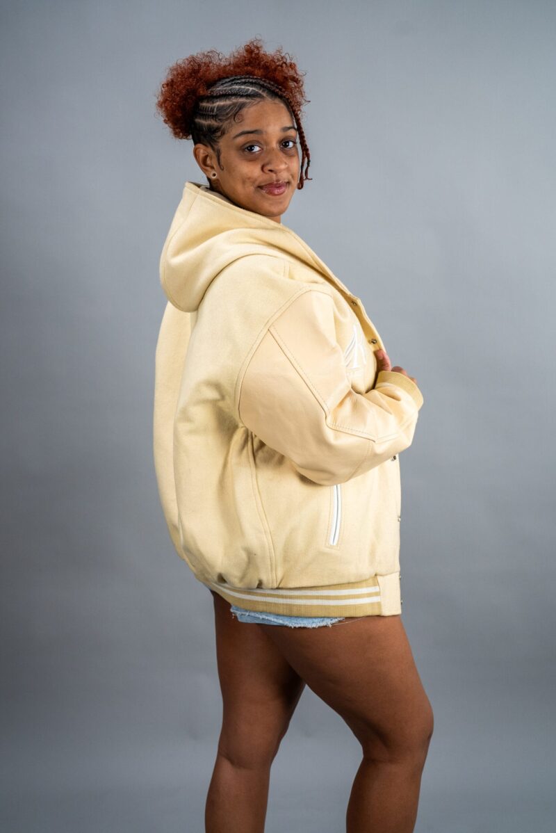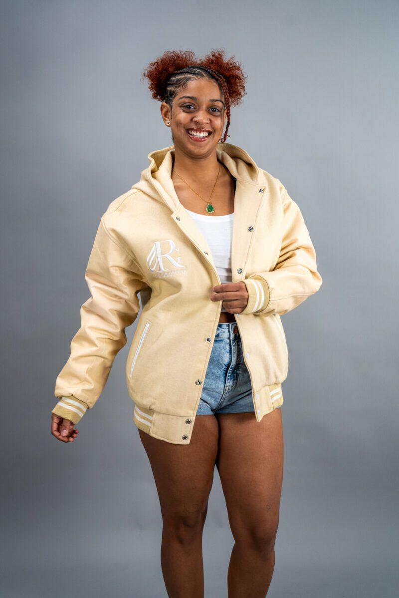 The hood provides added warmth and functionality, perfect for staying cozy and stylish during cooler weather. With a ribbed waistband and cuffs for a comfortable fit, and a fully lined polyester interior for extra comfort, this jacket ensures a modern take on the classic varsity look. The snap closure adds a traditional touch, making this jacket perfect for both men and women who want to stand out.