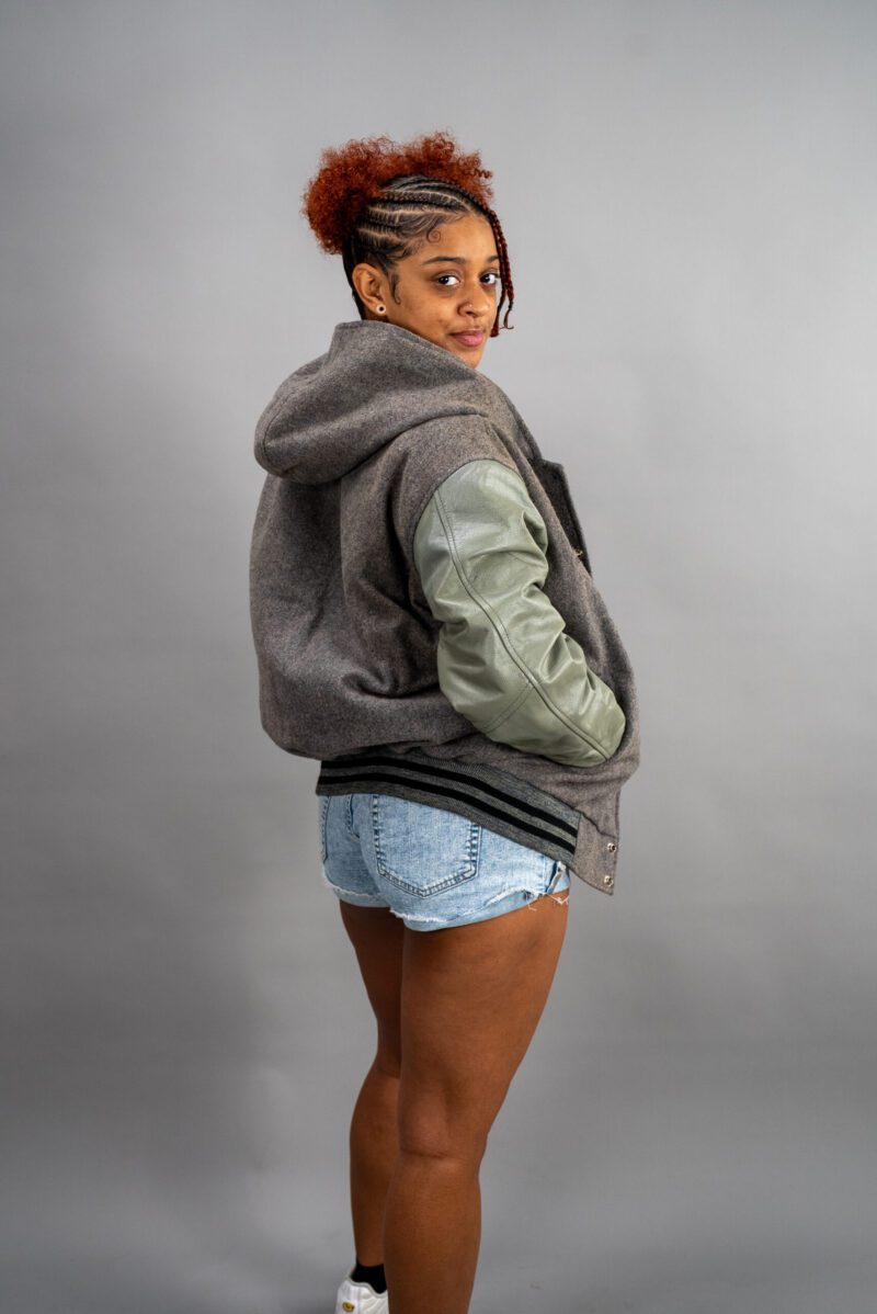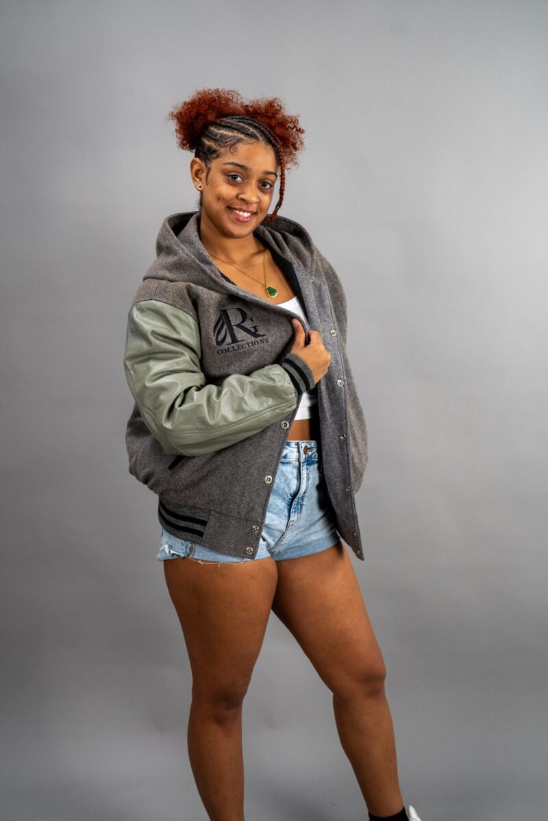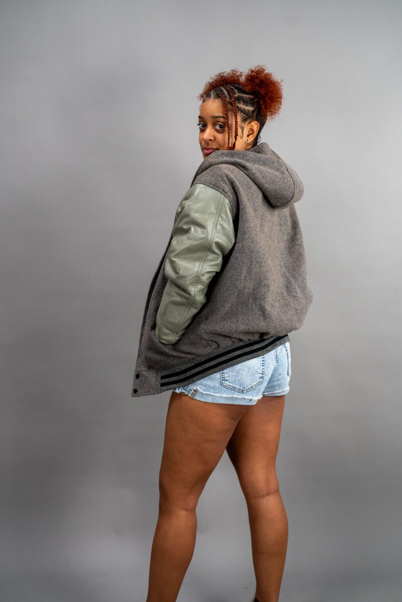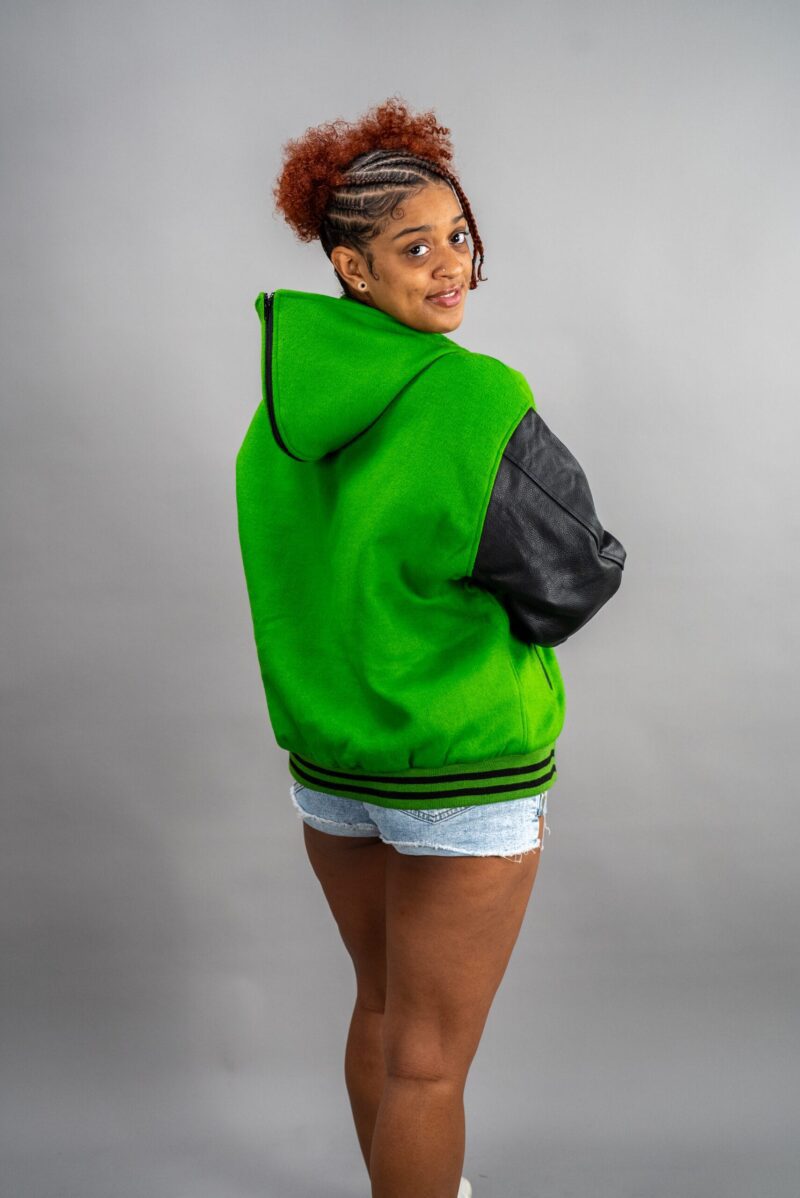 Make a bold statement with our Hooded Varsity Letterman Jacket, combining athletic style and fashion-forward design. Crafted with a premium wool body and genuine leather sleeves, this jacket brings both style and durability to your wardrobe.
